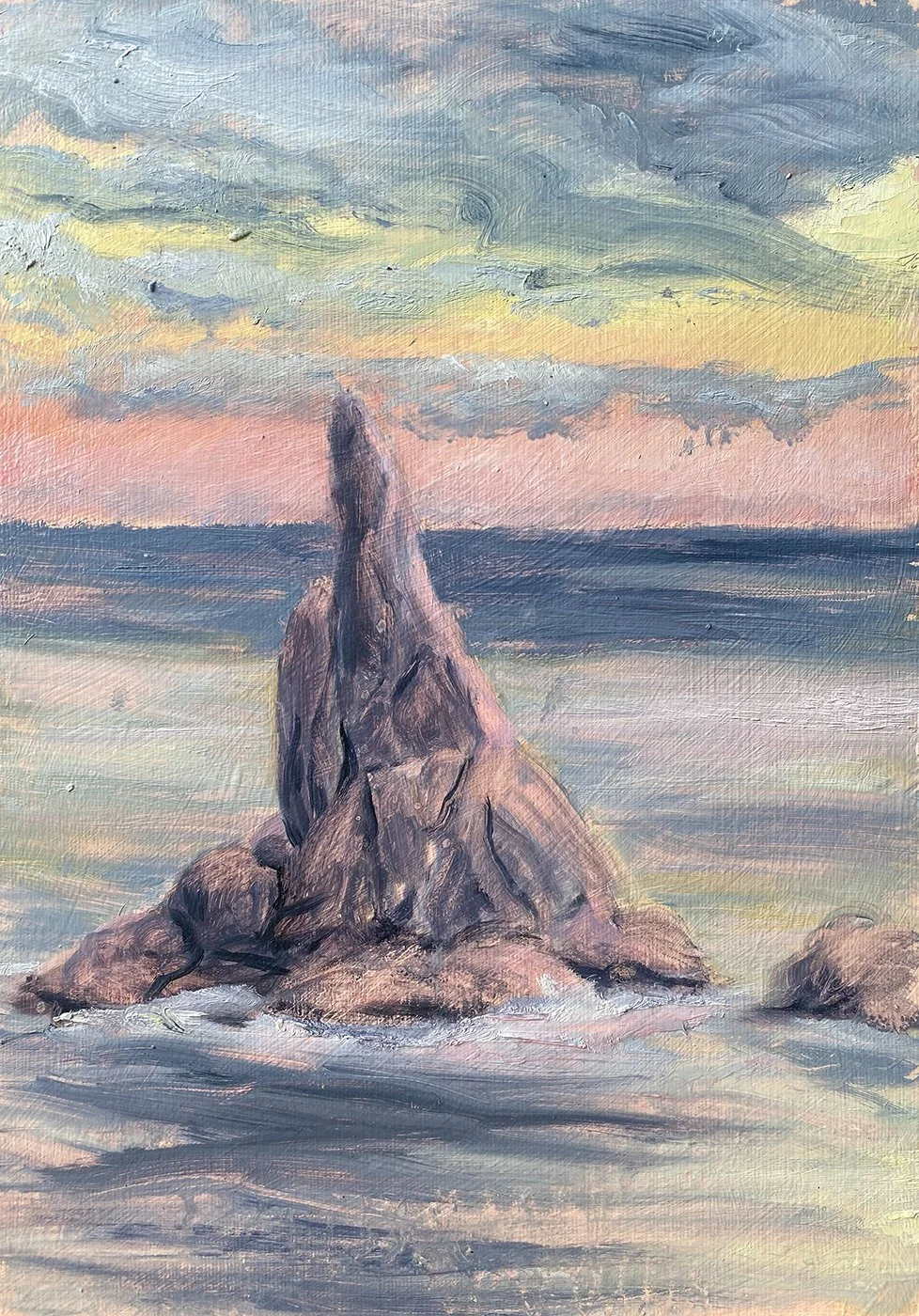 Call of the coast is a series of paintings based on getting away from it all and being immersed in a region on Tasmania’s north-east coast for six months. Making drawings and studies ideas developed into paintings about forms and space in the landscape. Nostalgic shacks contrast with the architecture of the natural environment, exploring expanses of sky and water. Light perpetually changes, the symphony of the ocean is ever-present, and brief epic personal moments intertwine with the prevalence of the everyday. Amid shoulder seasons, the offseason, and between occasional heavy weather events, a muted eeriness pervades. While the subject matter of these works concentrates on the external environment, each work filters through an inner world. The resulting paintings in this exhibition are formed from multiple experiences, responses embedded in paint to the call of the coast.